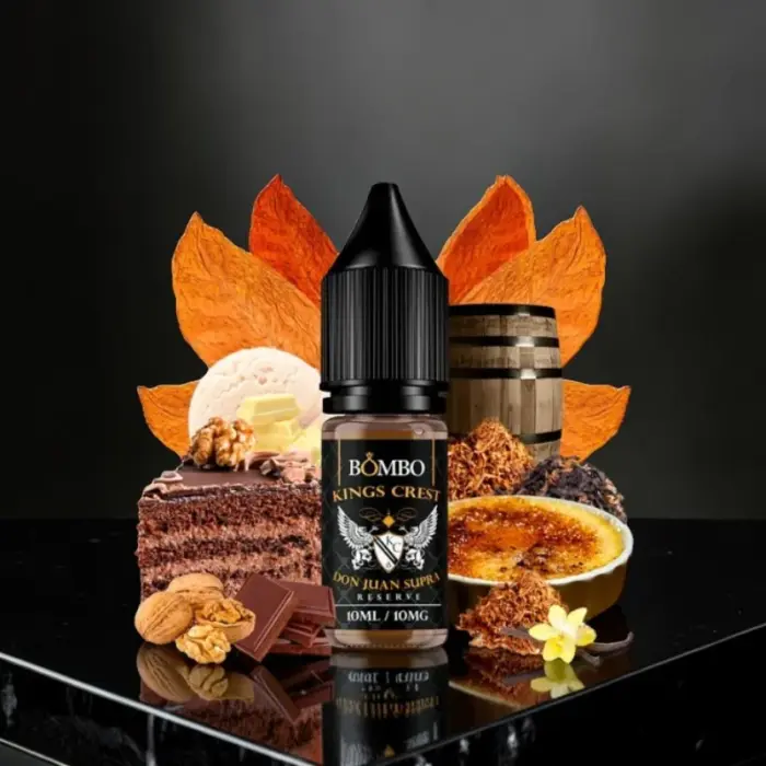 Descubre Don Juan Supra Reserve Salt de Kings Crest & Bombo, una sal de nicotina premium en presentación de 10ml, creada para los amantes de sabores postre. Este líquido combina de forma natural matices de tarta de chocolate, galletas y un toque a mantequilla de nueces pecanas, integrándose en una gama exclusiva para ofrecer una experiencia de vapeo refinada y auténtica.