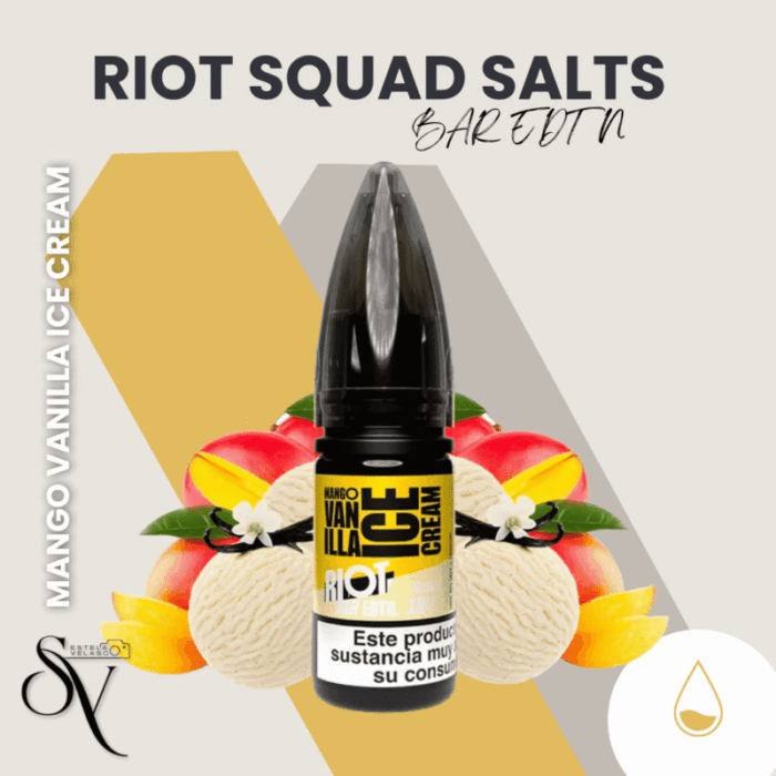 Las sales de nicotena Mango Vanilla Ice Cream – Riot Squad Salts de Riot Squad Salts te ofrecen una experiencia de vapeo potente, con sabores frutales entensos y equilibrados que satisfacen desde la primera calada.